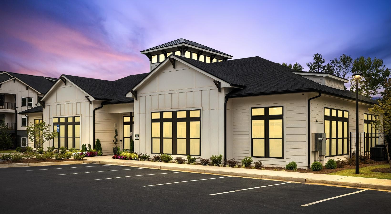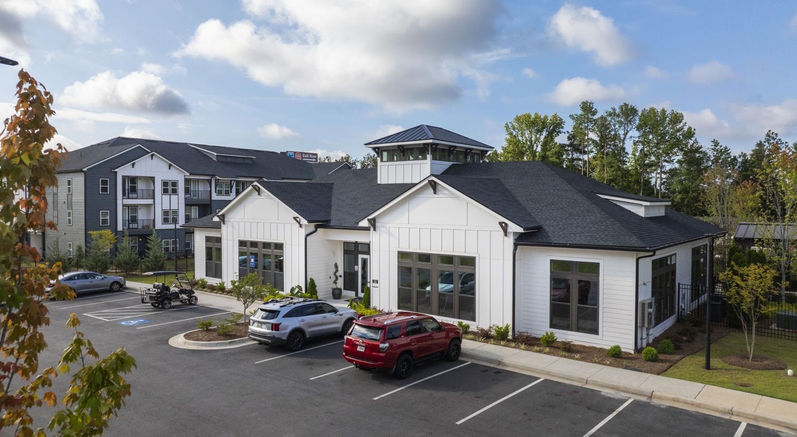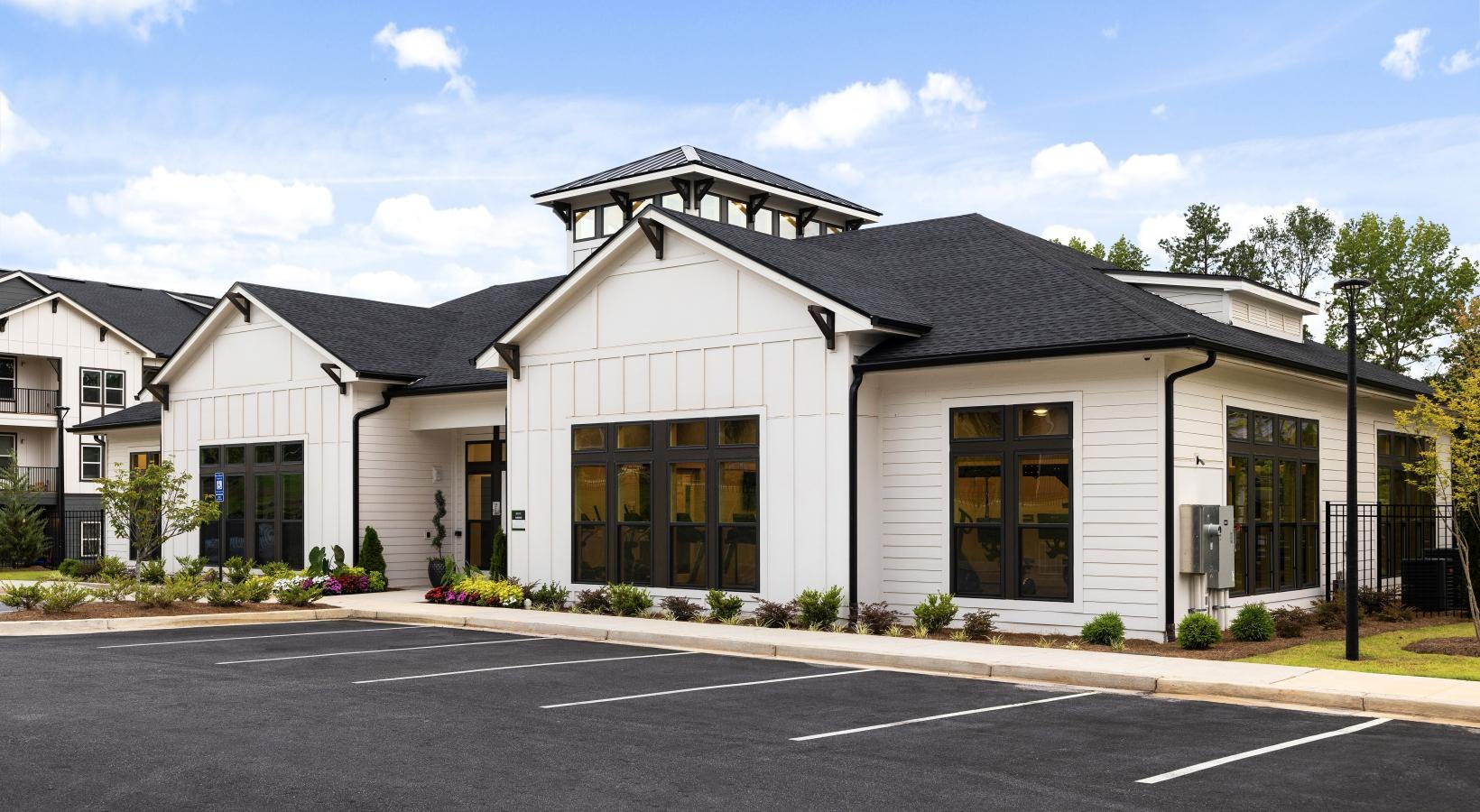 • a white building with a parking lot