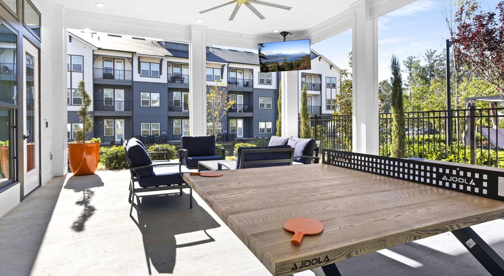 • a deck with chairs and a ping pong table