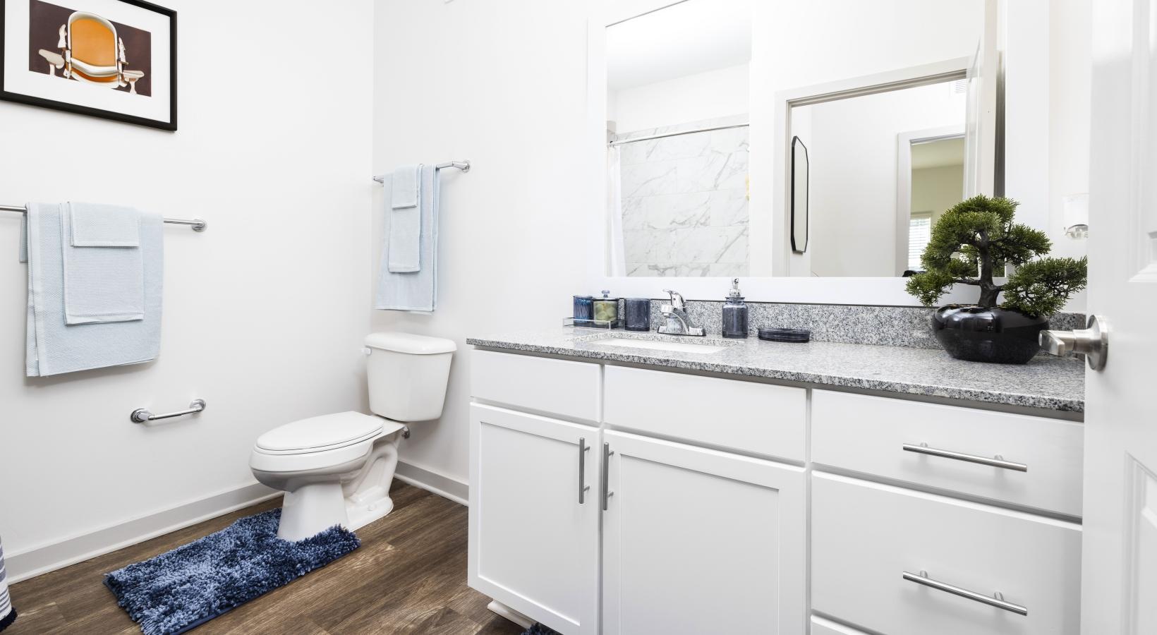 • a bathroom with a mirror toilet and sink