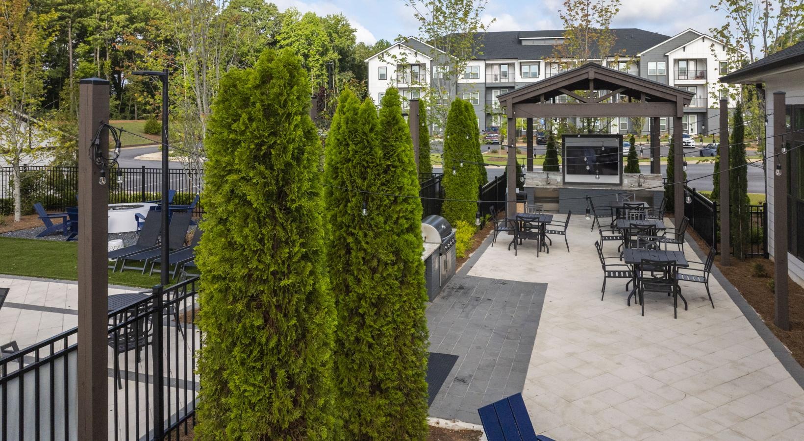 • a patio with tables and chairs and bushes on it