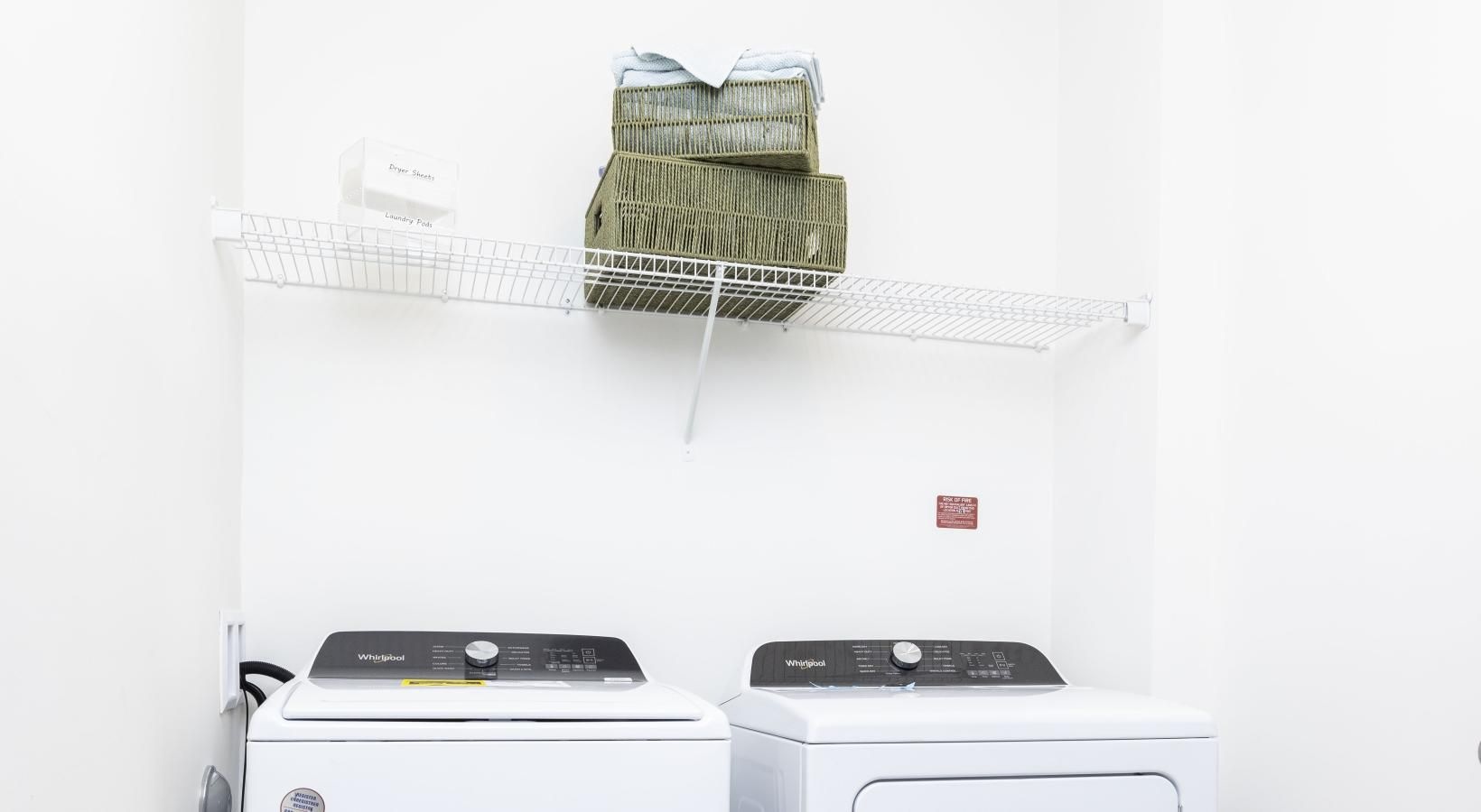 • a laundry room  with a washer and dryer shelf and a basket on top of it