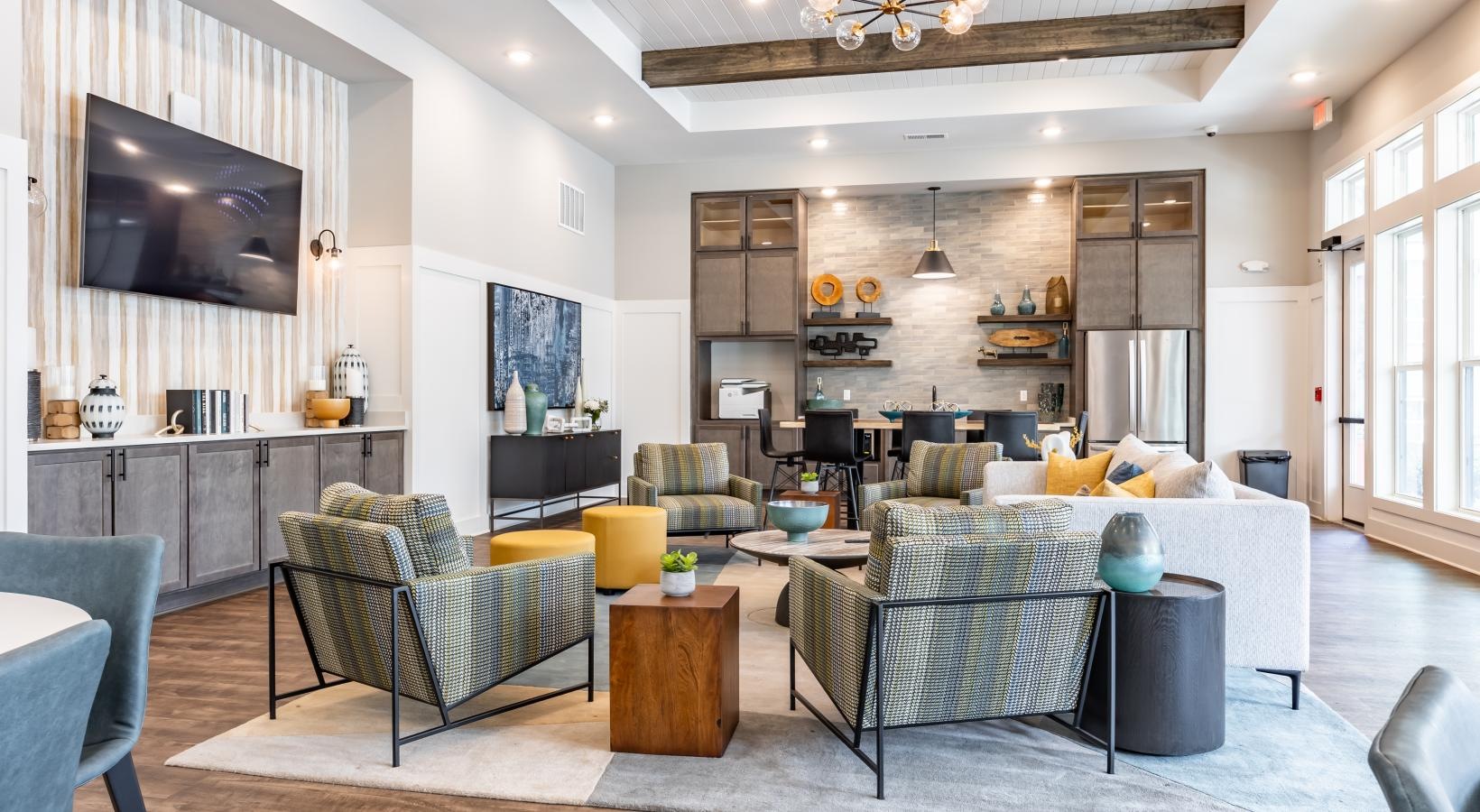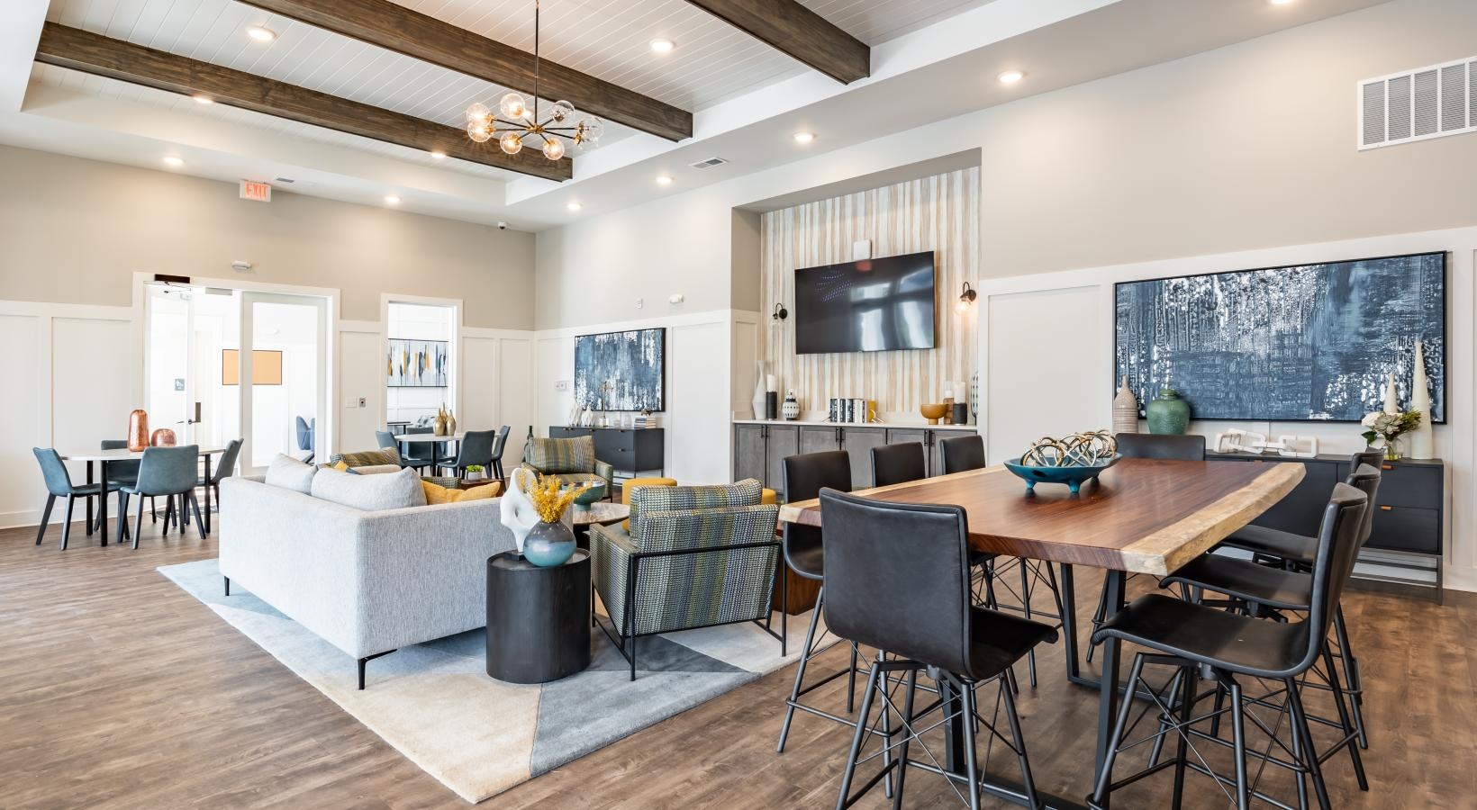 • a room with a table chairs and a tv